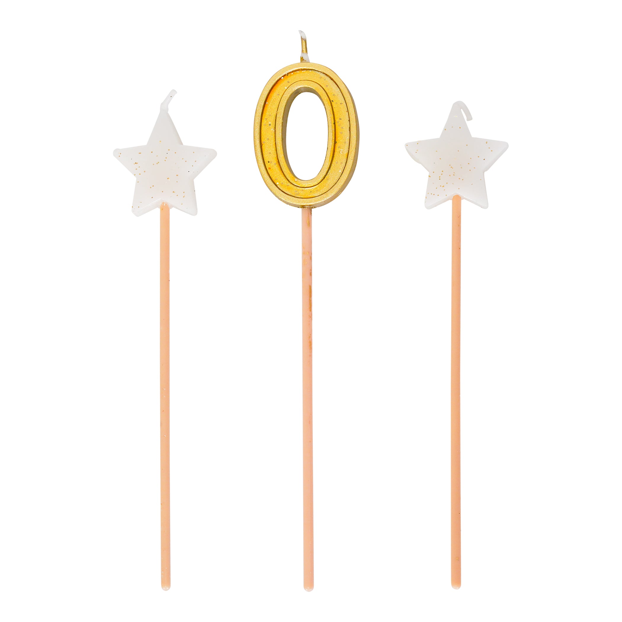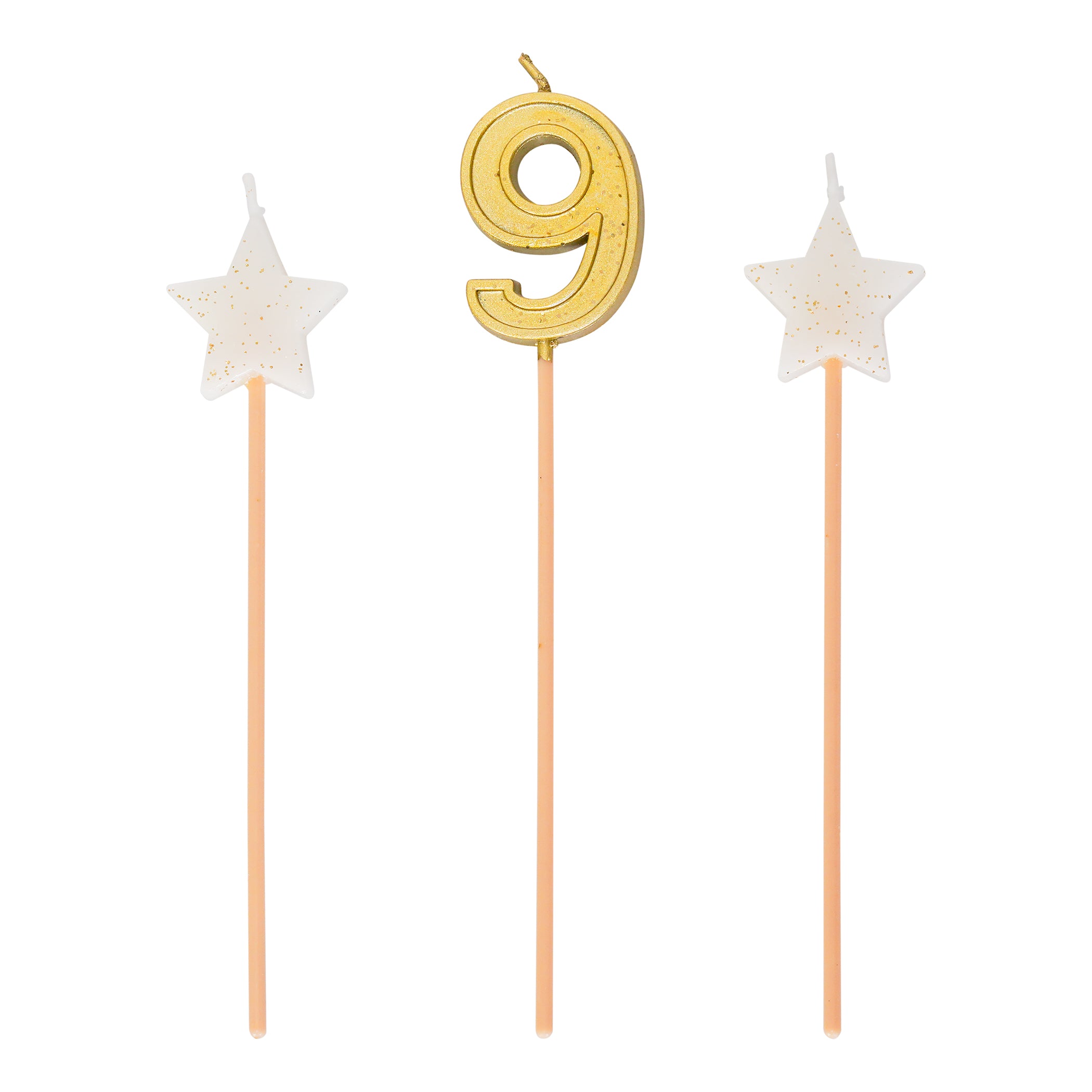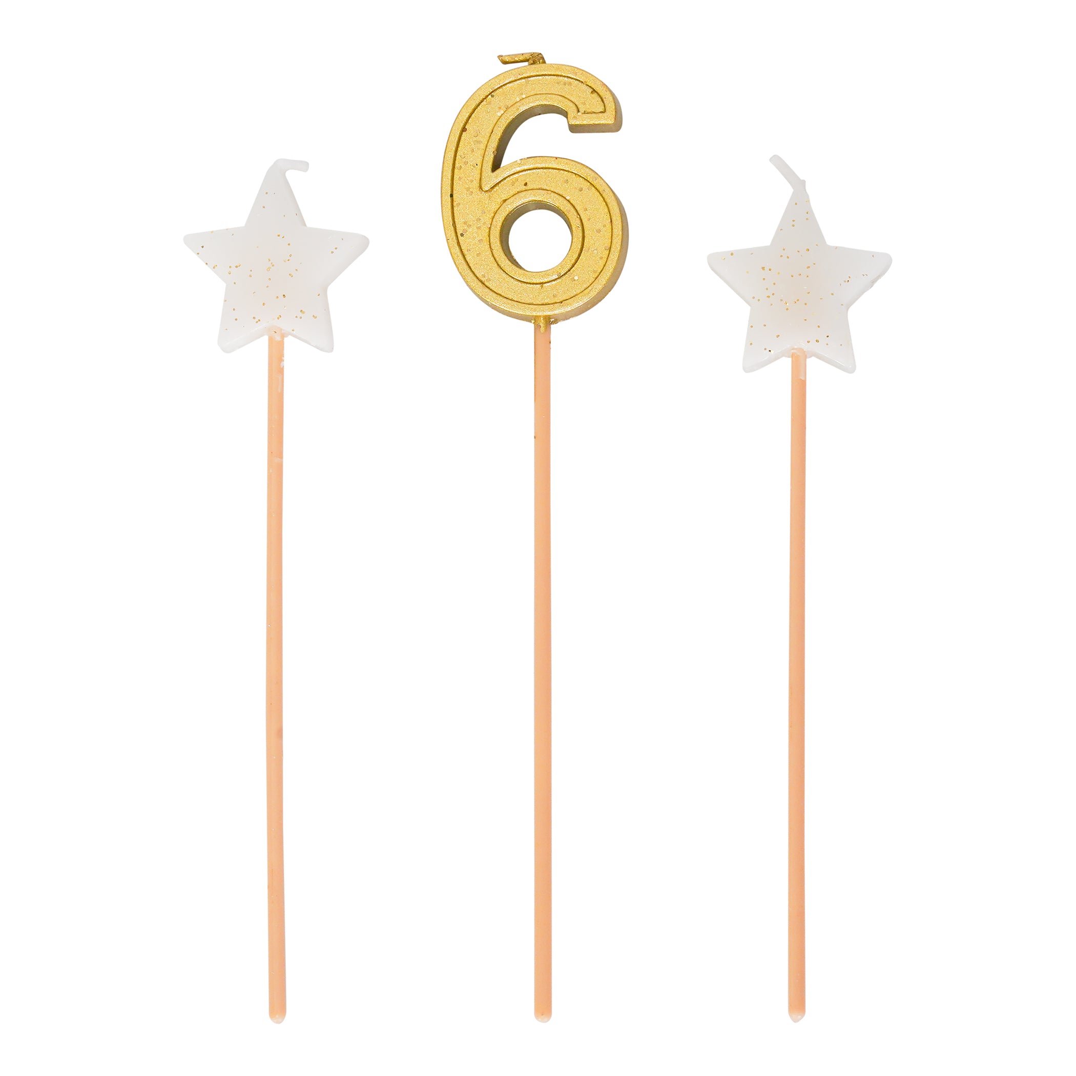 Make it a star-studded birthday with this tall, elegant trio of candles, perfect for a birthday or anniversary. The set features 2 glittery star-shaped candles and a gold number on 6-inch plastic picks. This model includes number candle #0 to #9.