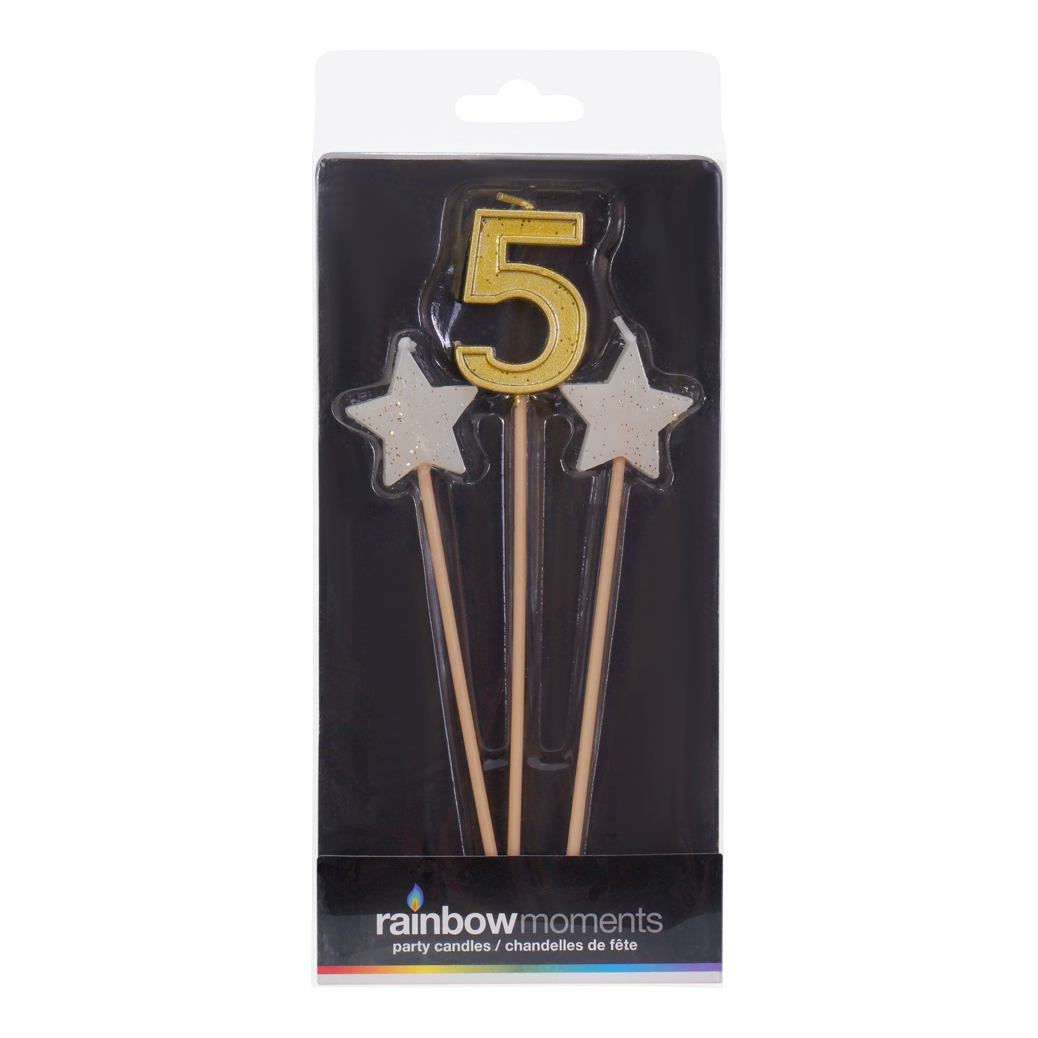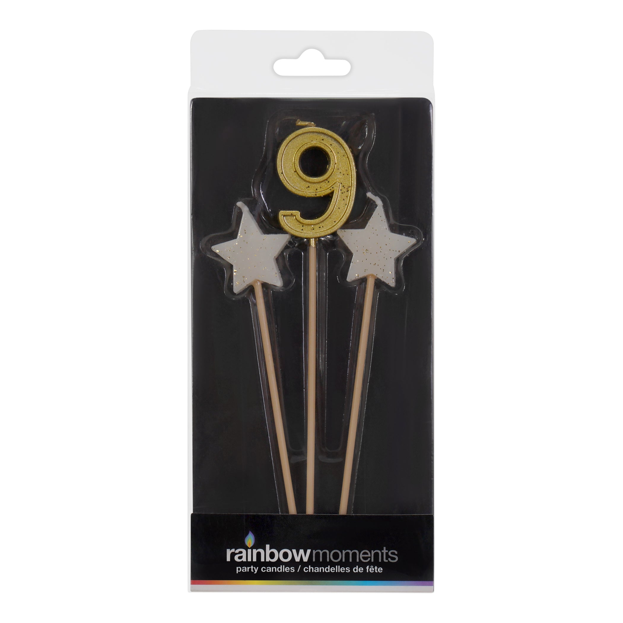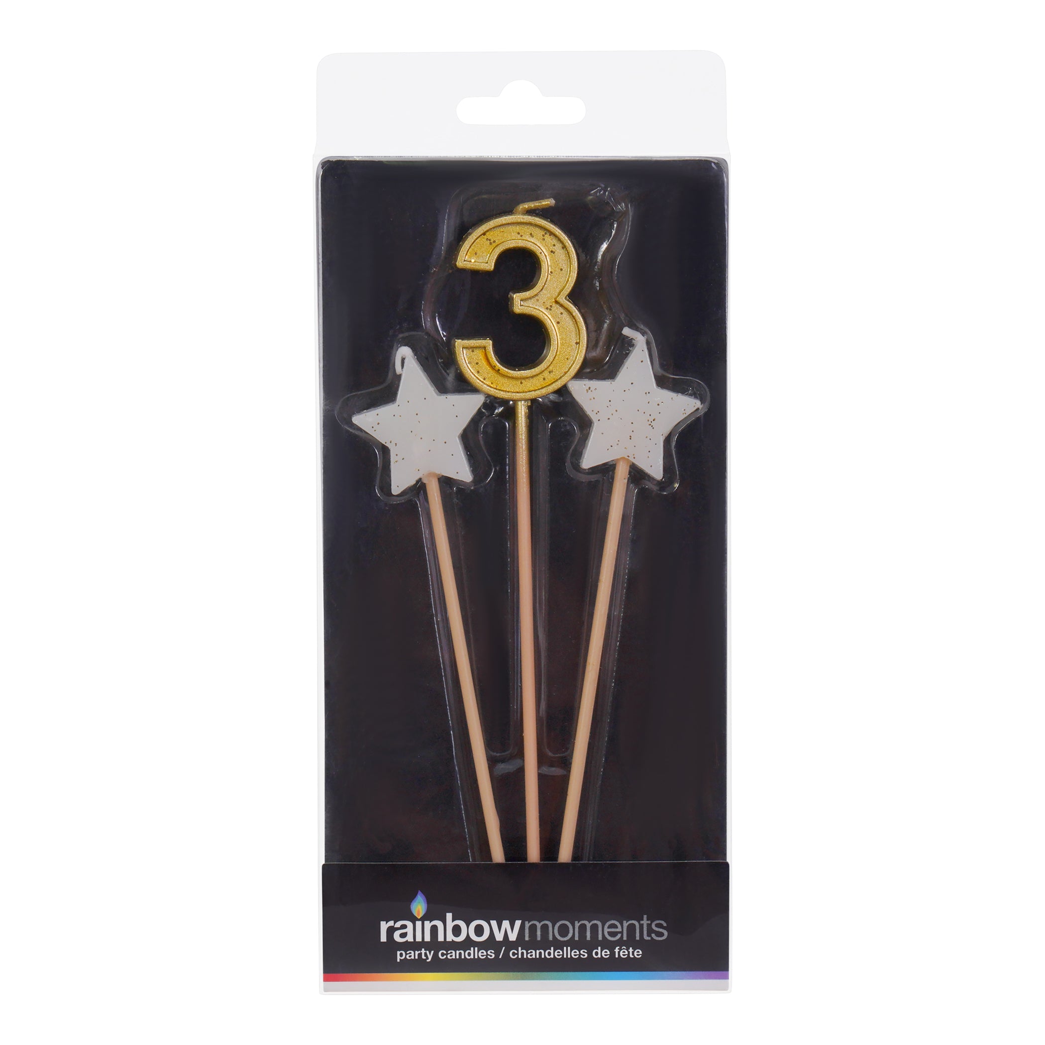 Make it a star-studded birthday with this tall, elegant trio of candles, perfect for a birthday or anniversary. The set features 2 glittery star-shaped candles and a gold number on 6-inch plastic picks. This model includes number candle #0 to #9.