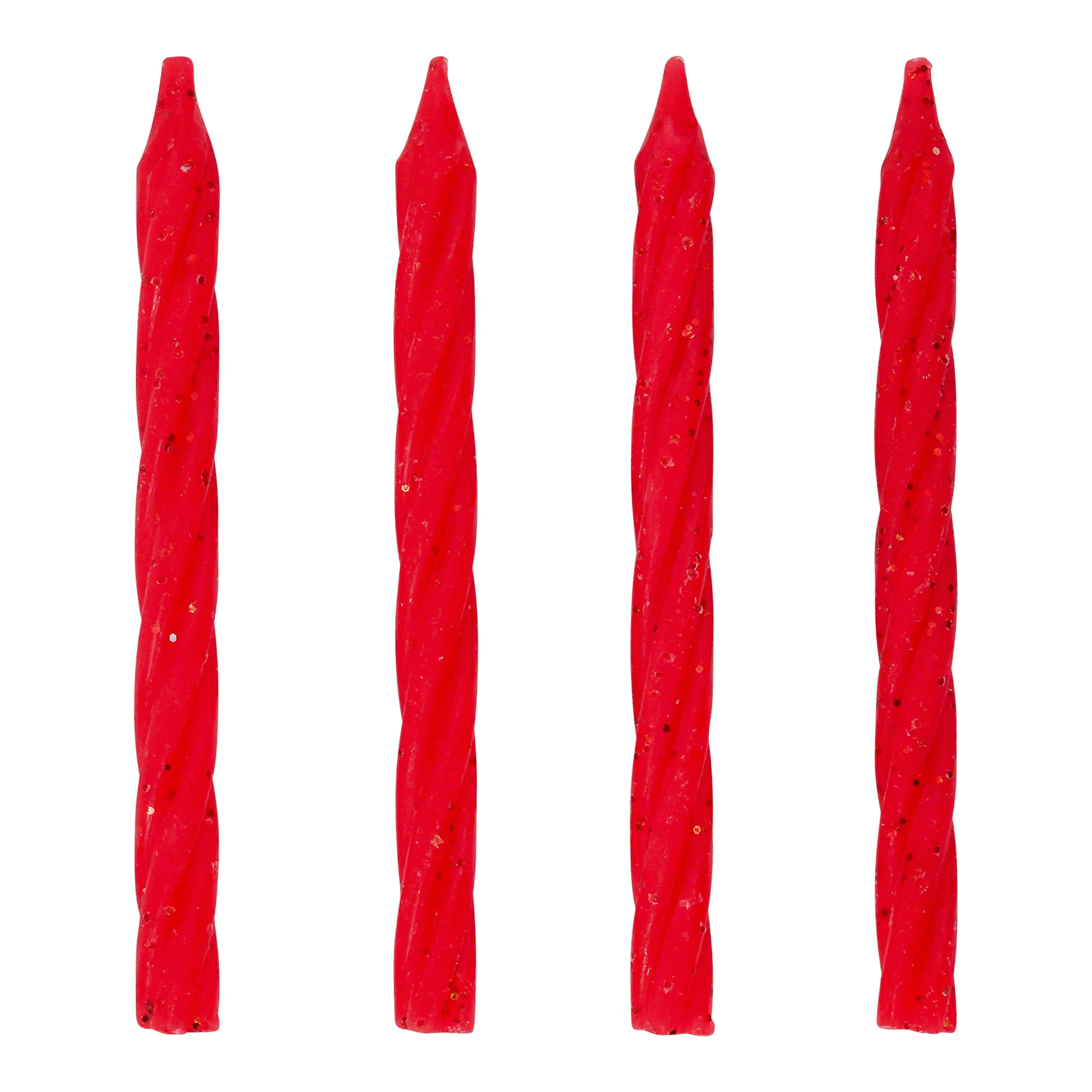 Light up a birthday cake with these red spiral birthday candles that will bring a splash of color to your cake. These candles come in a pack of 24 in a classic red color. They feature a swirl design covered in a glittery coat to add sparkle and fun to the party.